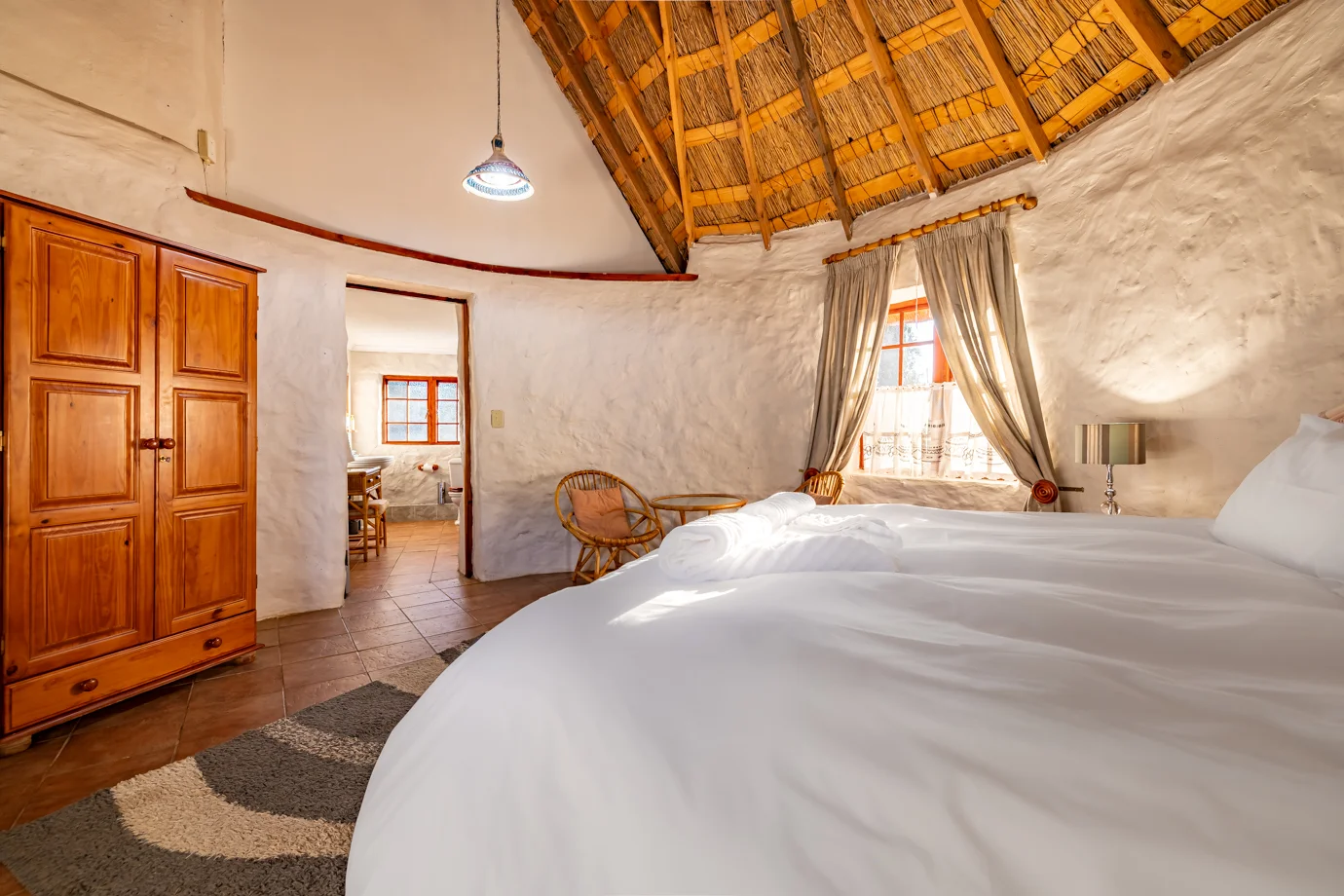 - Khotso Suite: Our premium rondavel, Khotso is a spacious double en-suite featuring both a bath and a shower. The suite includes a separate lounge area, offering extra space, comfort, and a more relaxed stay.